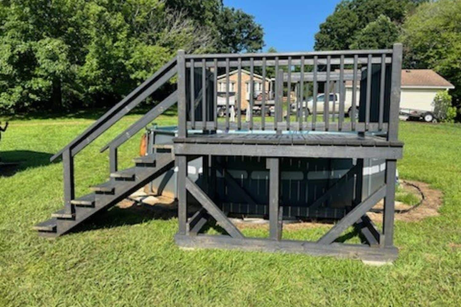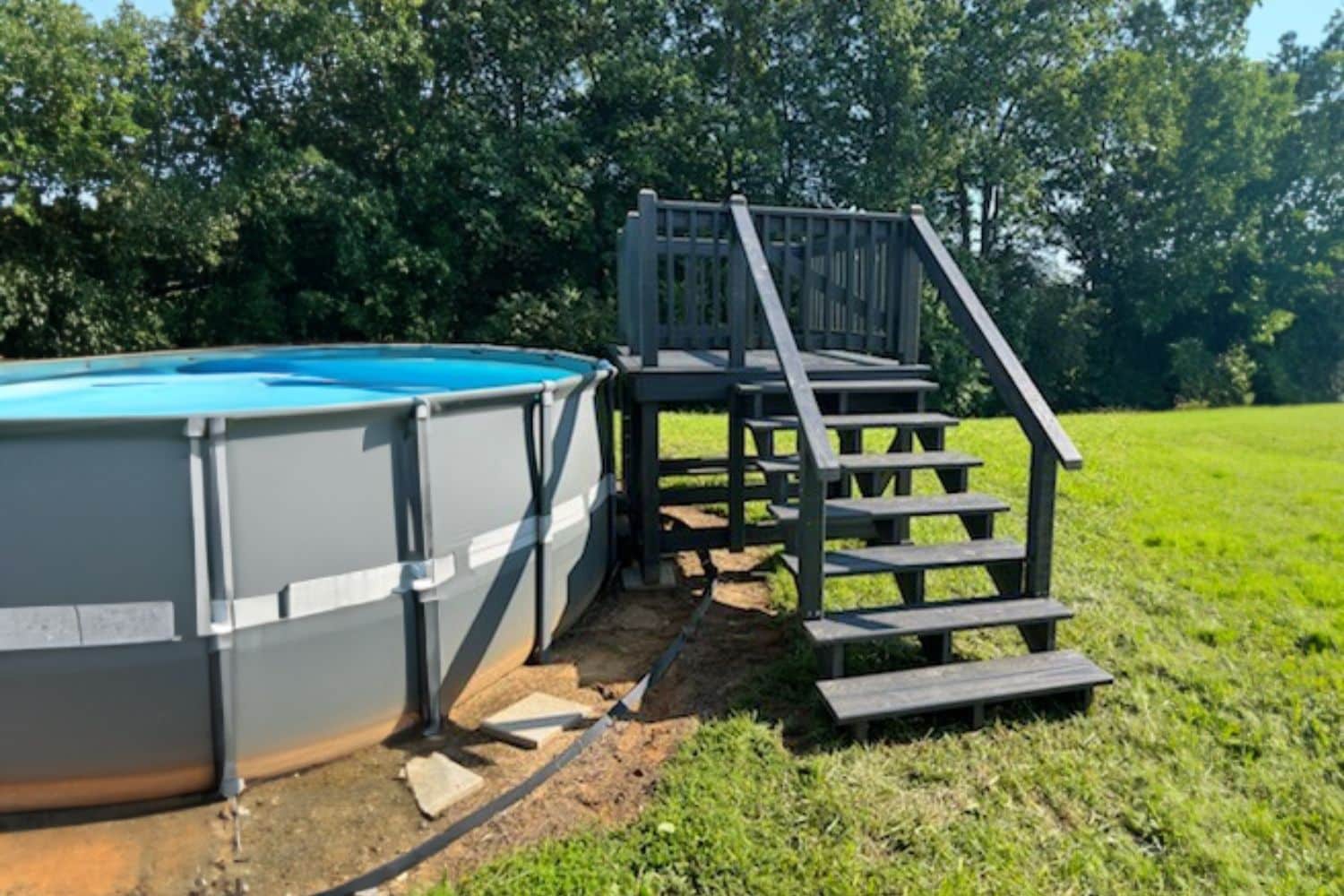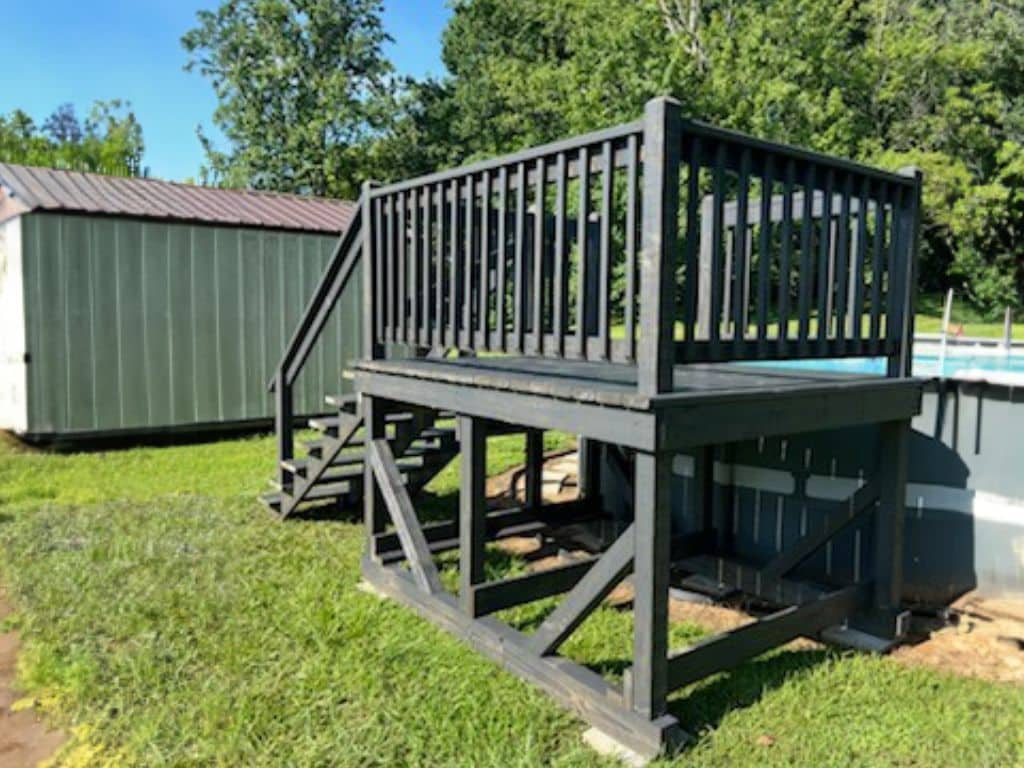 This 6×8 gray-stained pool deck with a gate was built to blend safety, function, and modern style. The rich gray stain gives it a bold, polished look that pairs perfectly with the pool, while the gate adds an extra layer of security for peace of mind. Though compact, this deck makes a big impact, offering the perfect place to dry off, relax, or soak up the sun between swims.