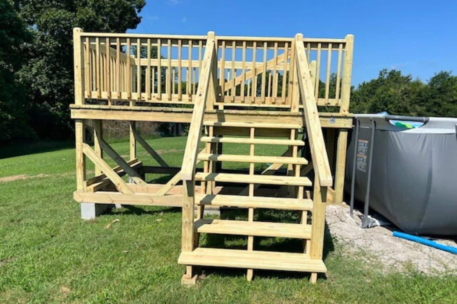 This 8×12 pool deck with a gate offers the perfect blend of safety, convenience, and outdoor enjoyment. Built from durable treated lumber, it provides a sturdy platform that makes entering and exiting the pool easy and secure. The elevated design and protective railing give it a clean, finished look, creating a functional and stylish space for lounging, sunbathing, or watching the kids swim.