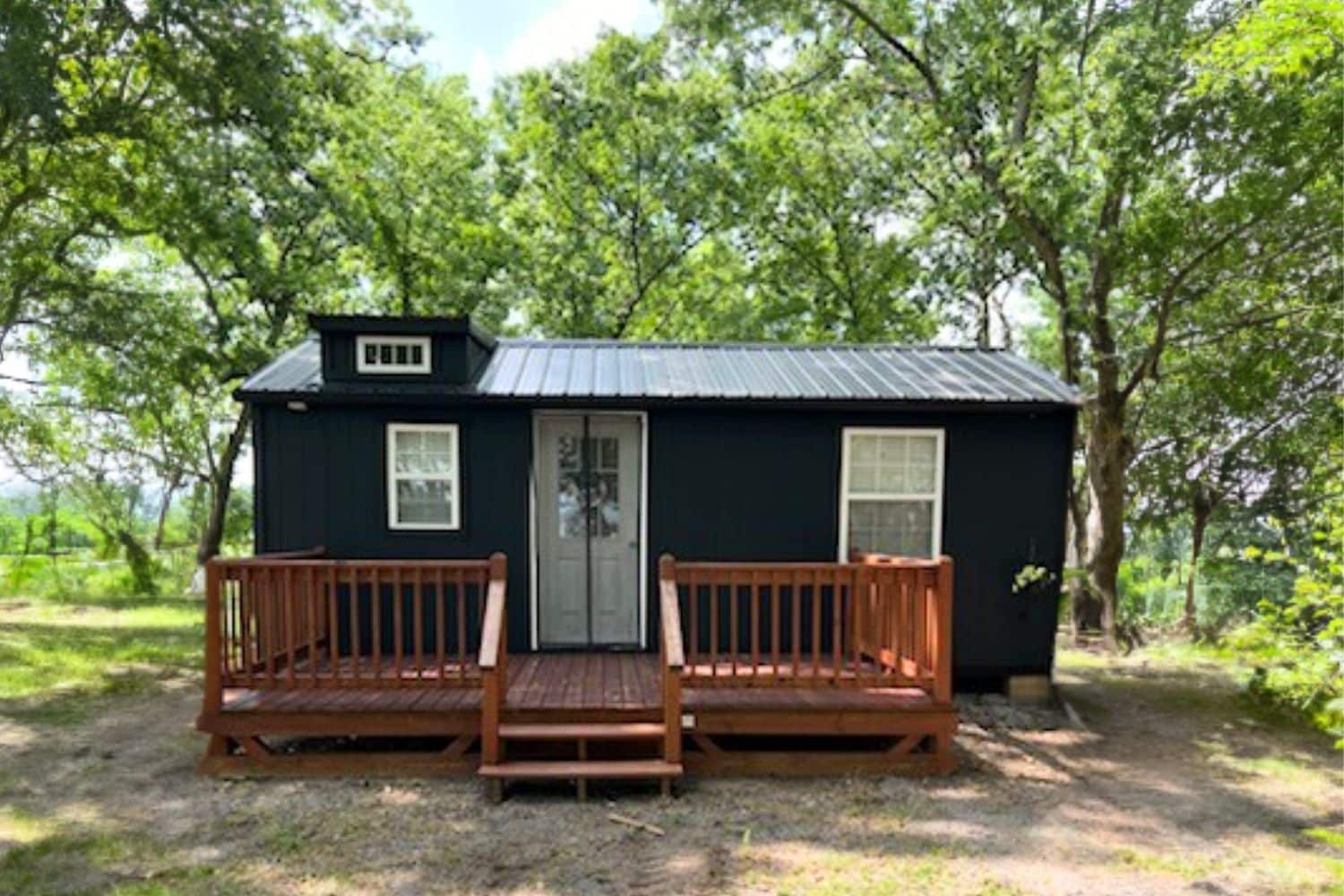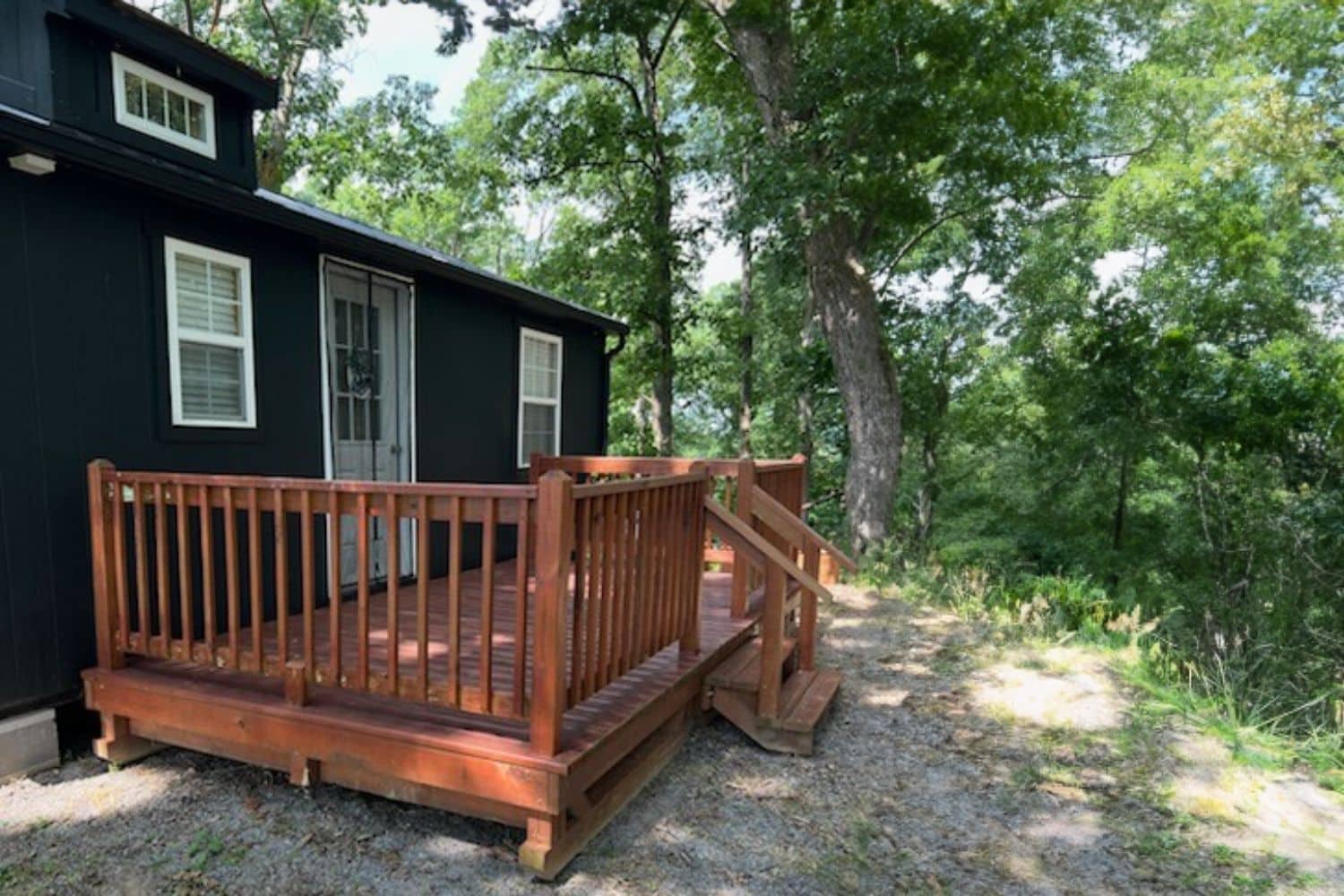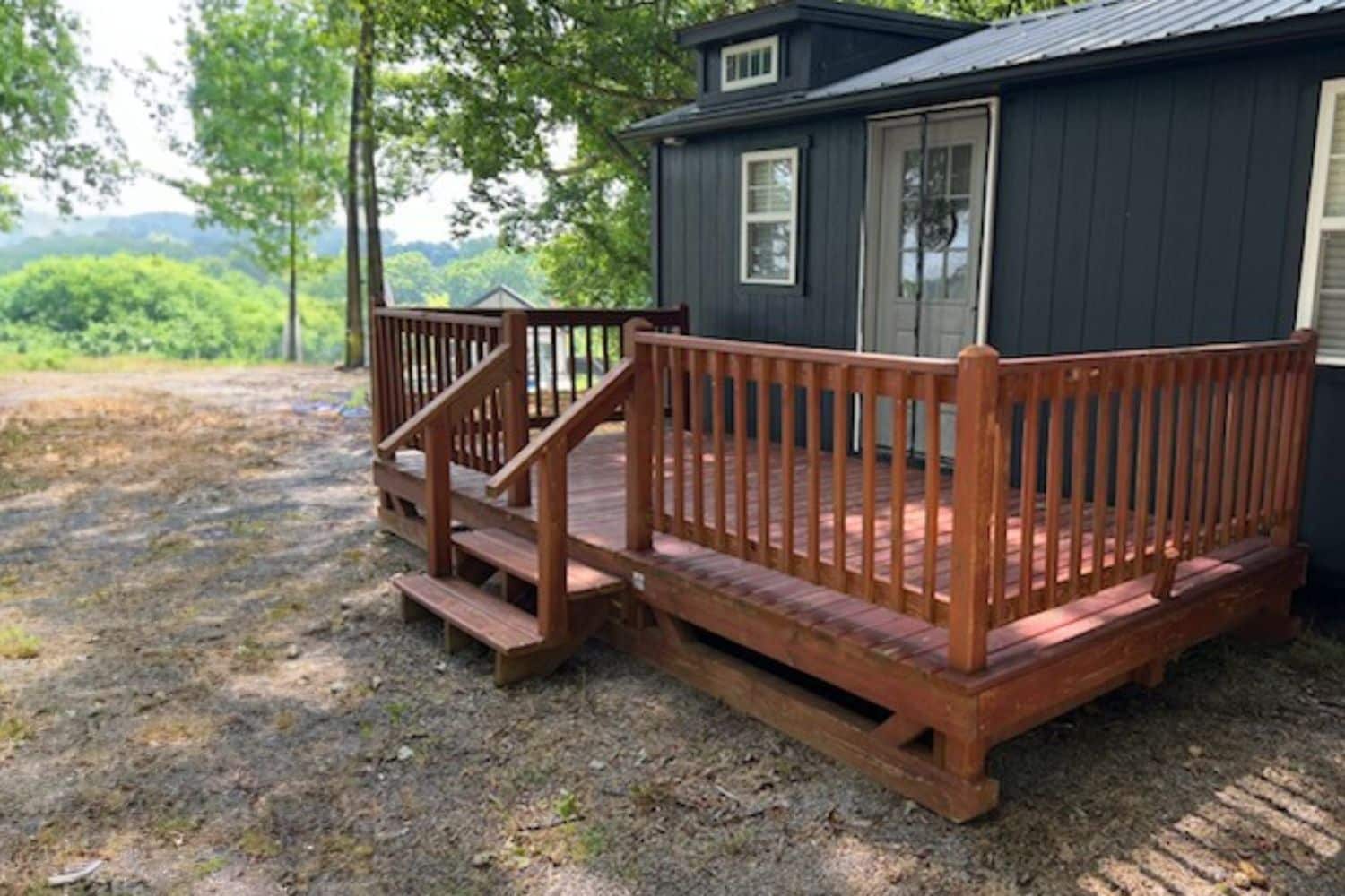 Take a look at this 18×16 cabin deck in Scottsville, Kentucky, a stunning addition finished with a warm cedar stain that brings out the natural beauty of the wood. With its solid railings, simple entry steps, and smooth layout, this deck blends perfectly with the cabin’s modern black exterior. It’s a welcoming space built for comfort, style, and everyday outdoor living.