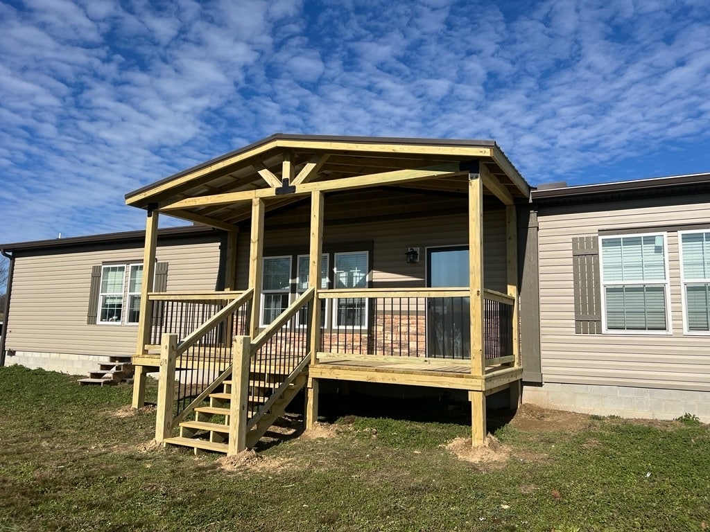 Eshco constructed this 8×22 porch in Morrison, TN, complete with an A-frame metal roof and 6×6 support posts for exceptional strength. Built on site, the design features a balanced structure with wood and metal details, providing a functional and attractive outdoor entry space.