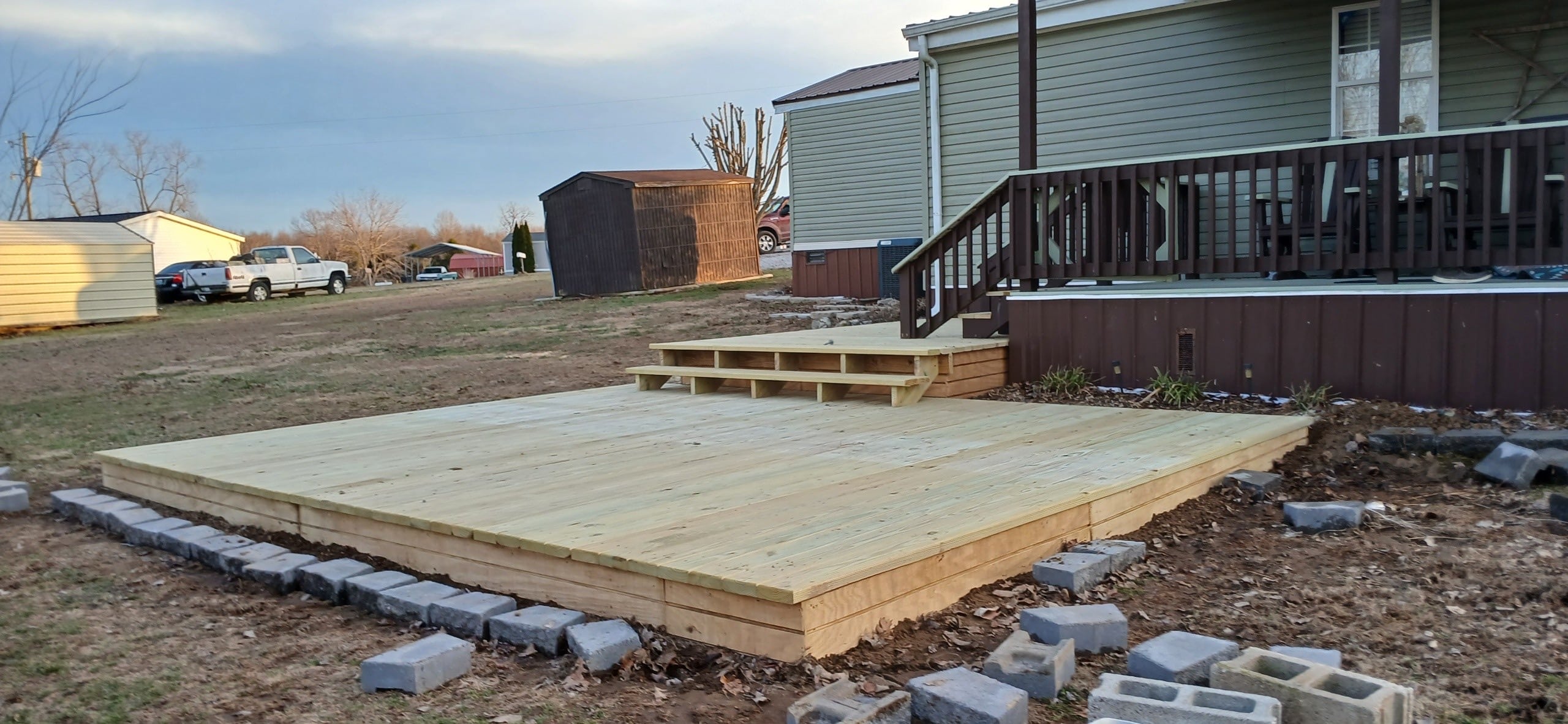 Eshco built this custom split-level patio deck in Beaver Dam, KY; a two-piece design measuring 9×12 and 14×18. The project features durable wood construction, a smooth tiered layout, and finished underpinning for a clean, elevated look that extends the home’s outdoor space beautifully.